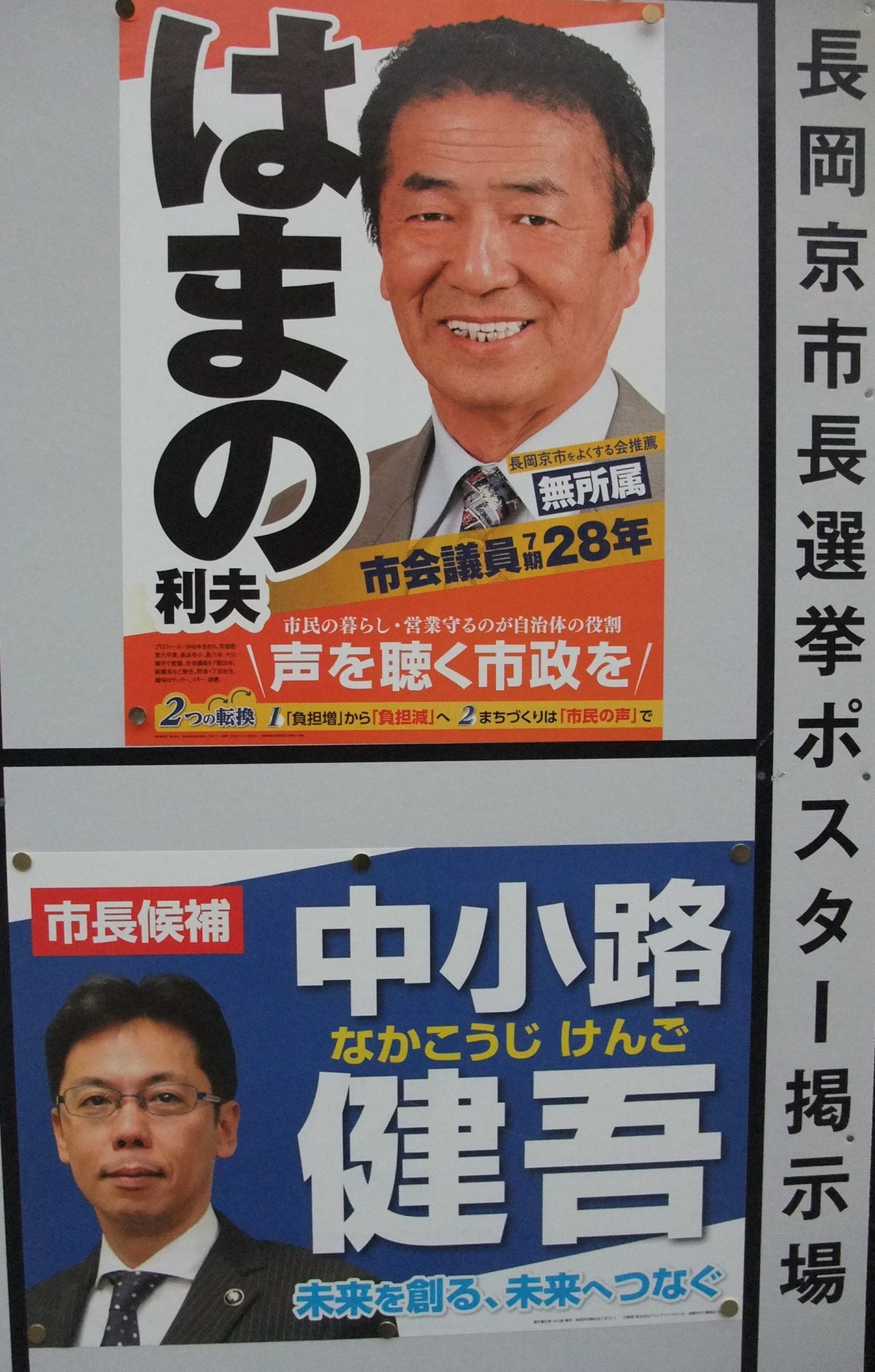 京都府 向日市議会議員選挙のポスター一覧。阪急電車 東向日駅 西口ロータリーにて。元 同志社高校写真部部長・中学時代は写真部副部長 増田真知宇